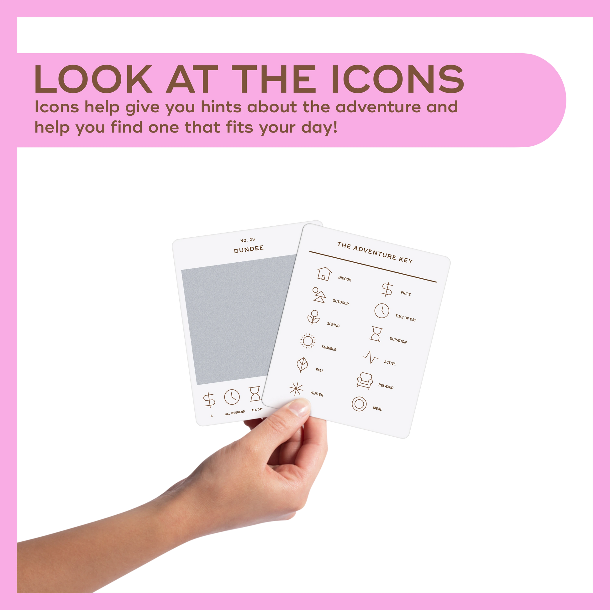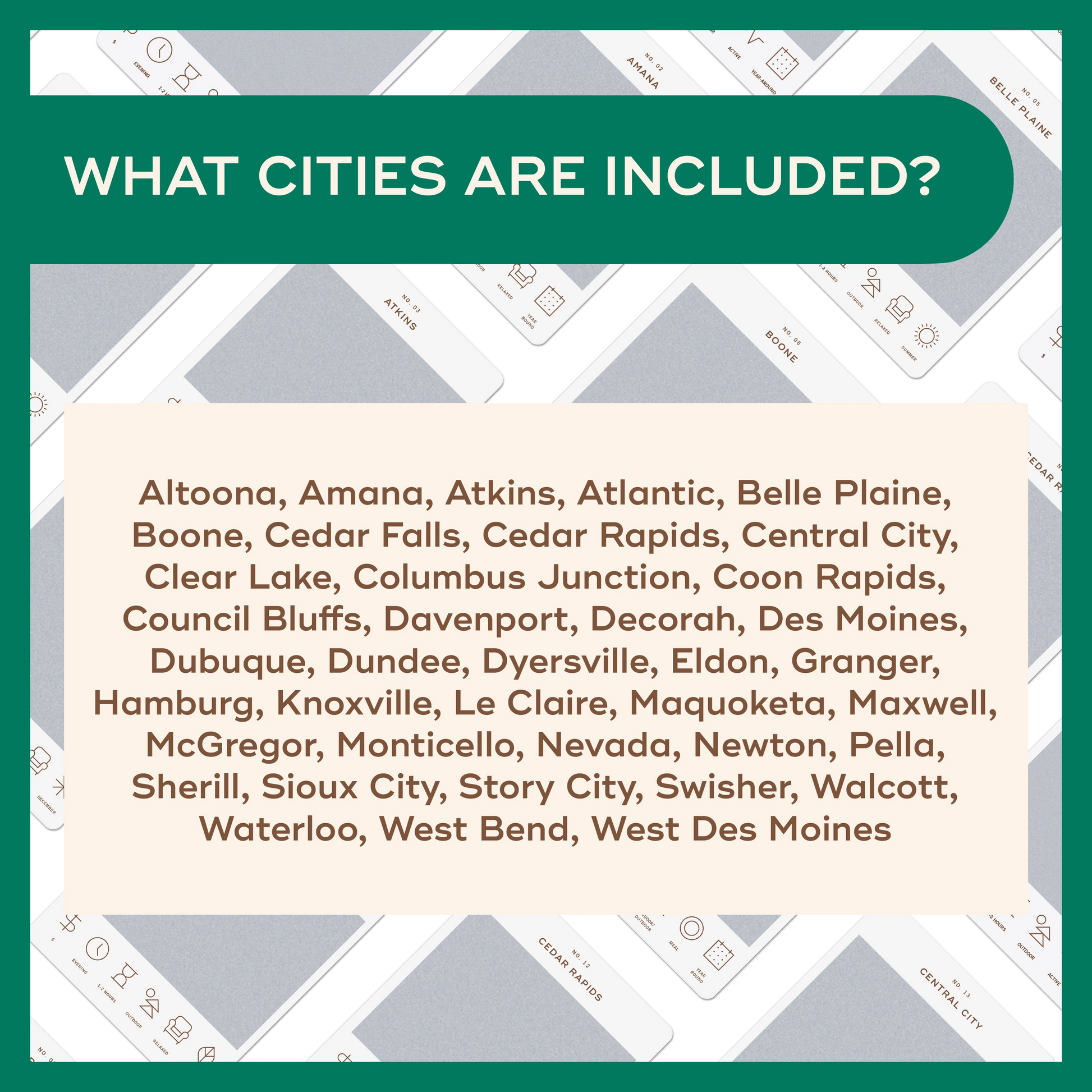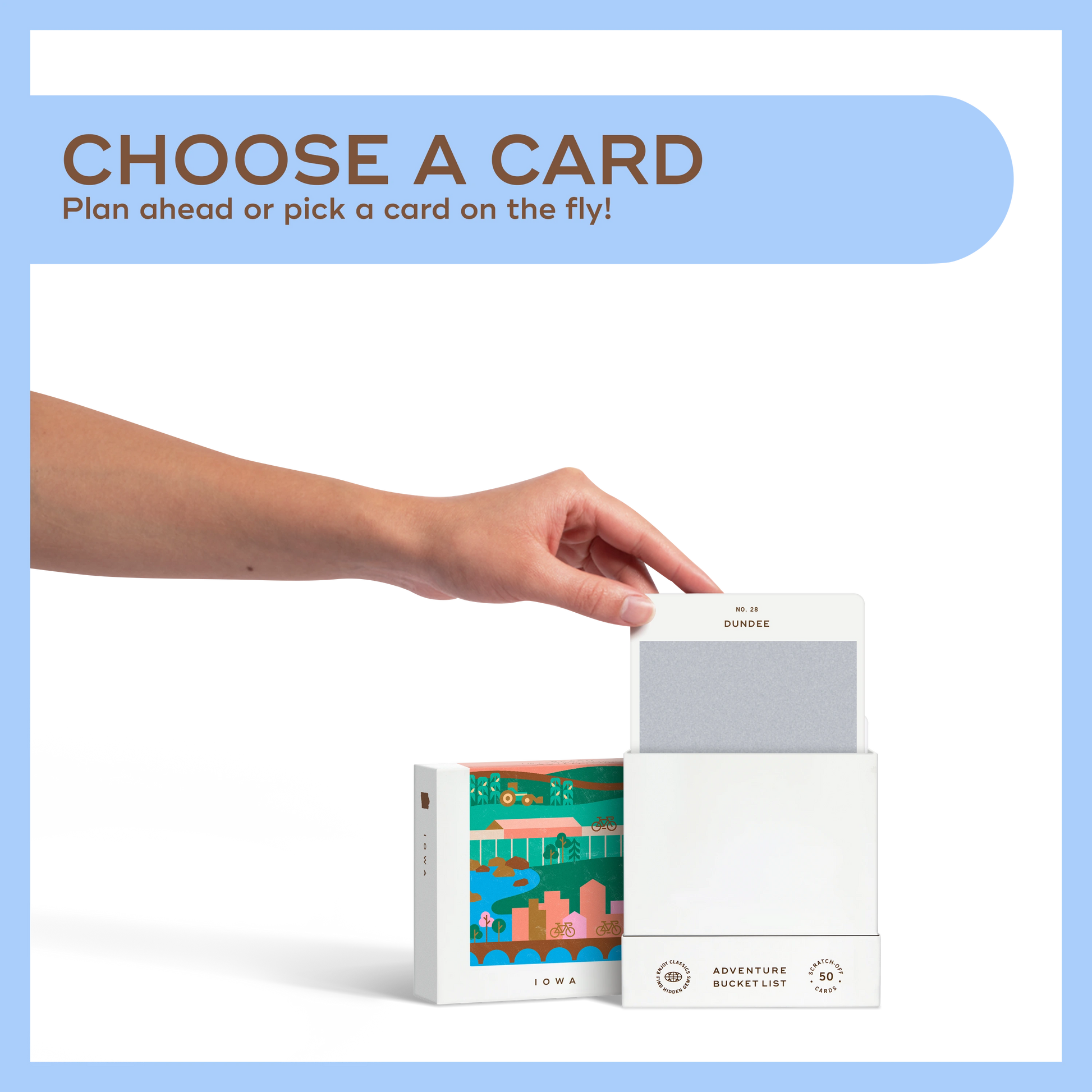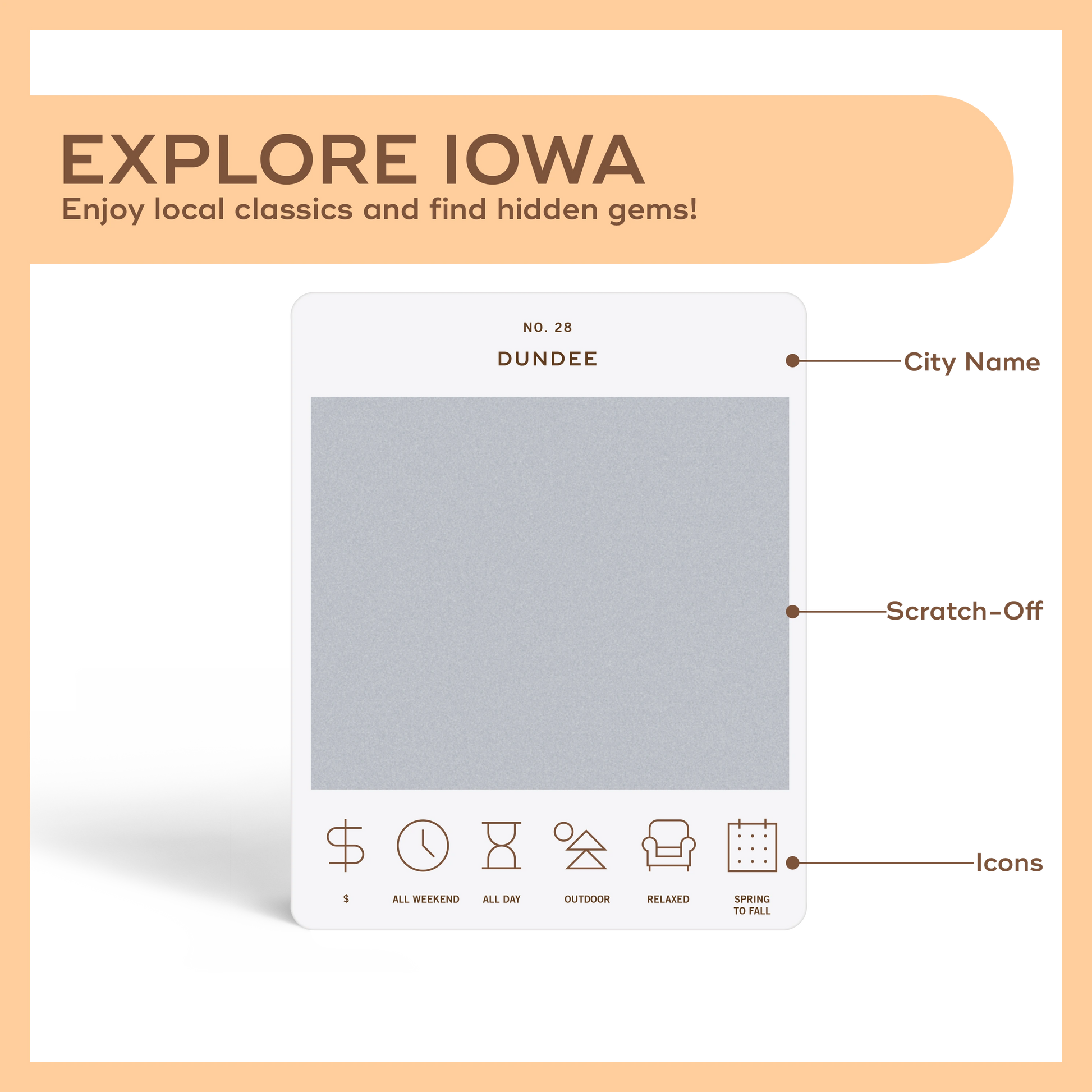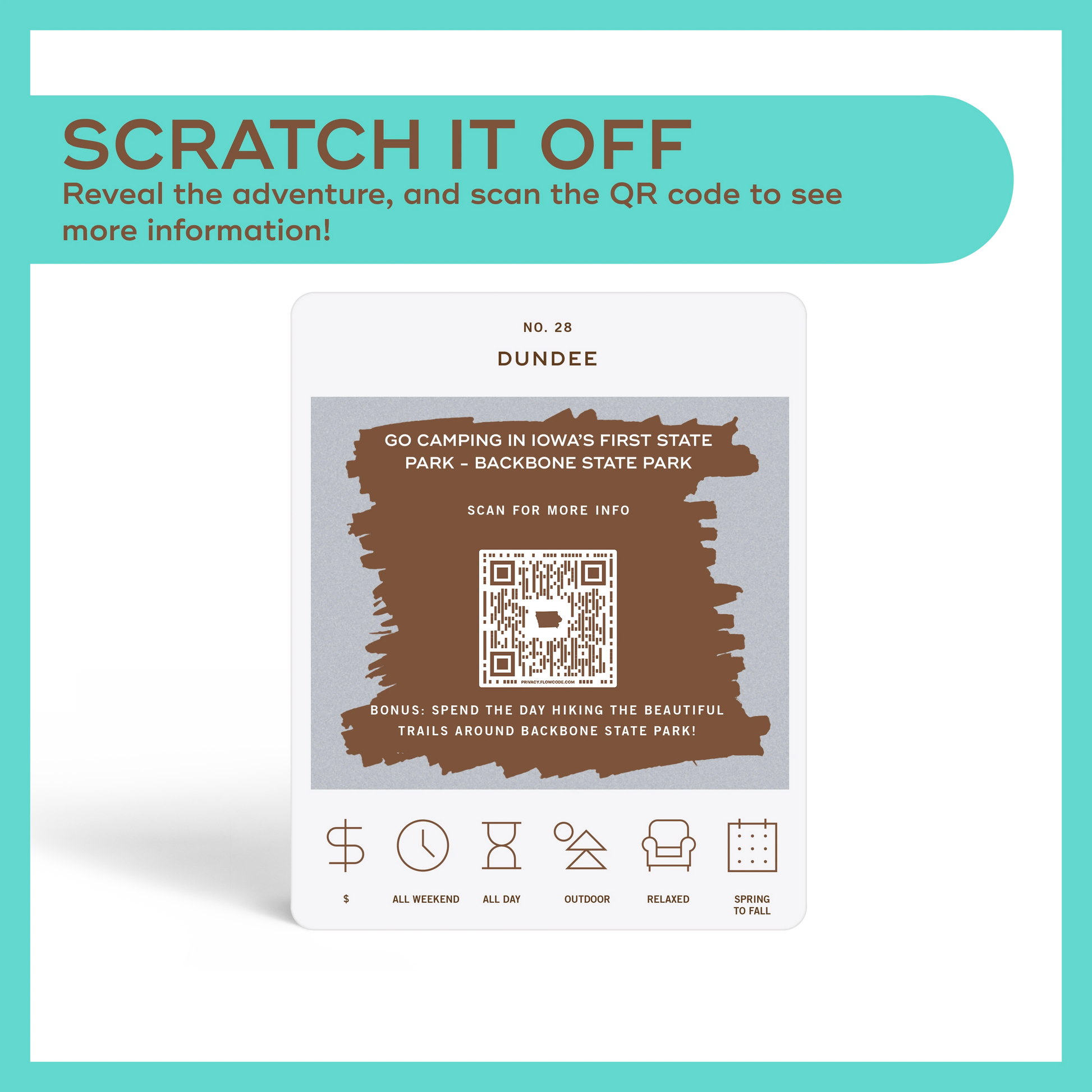50 scratch off bucket list adventures around the state of Iowa. Pick a city that you want to explore, check out the icons at the bottom of the card to determine the season, cost, and time of day, and then scratch off the card to reveal your adventure!