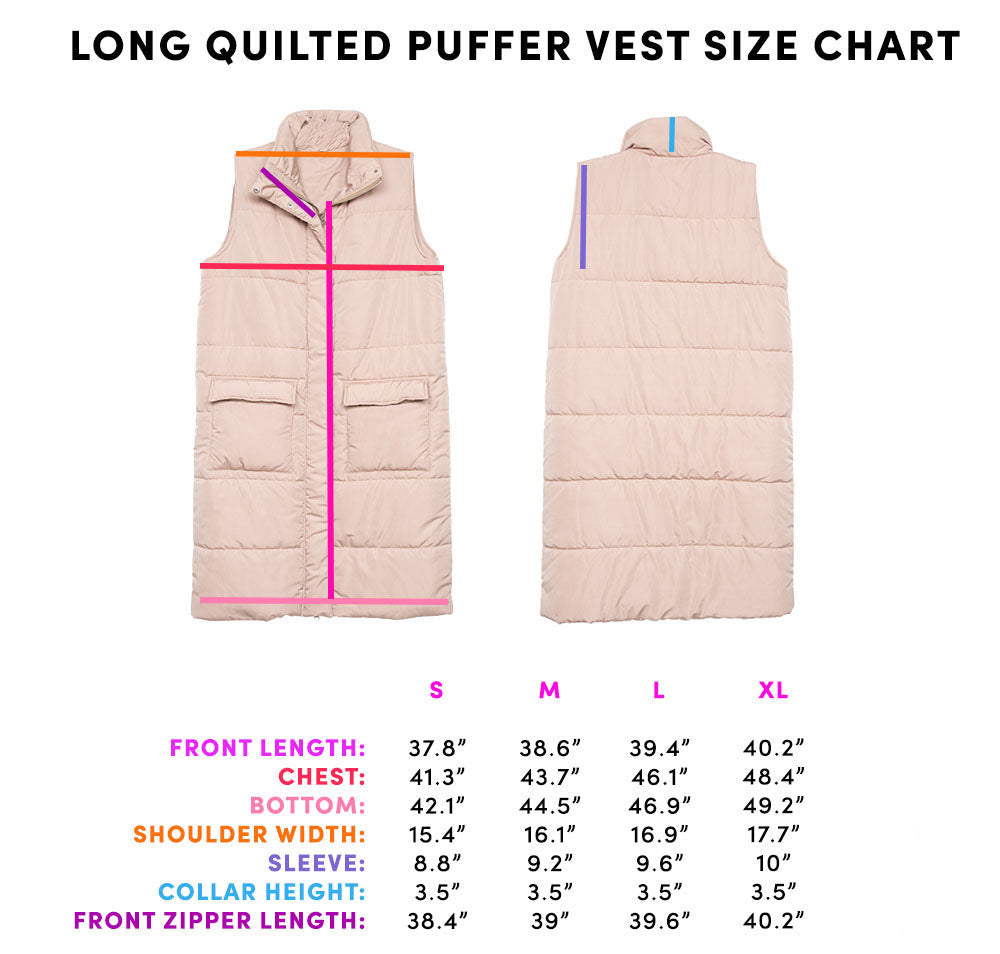 Lightweight but warm, trendy yet timeless—this black long puffer vest is an essential for the colder seasons. Designed to hit at the knee, it offers that just-right amount of coverage for chilly fall days, while the minimalist design ensures it complements any outfit. With a comfy quilted design and a stylish zip-up front, it’s perfect for fashion-forward layering that still feels effortless. Trust us, this vest won’t just hang around… it’ll sell out fast.