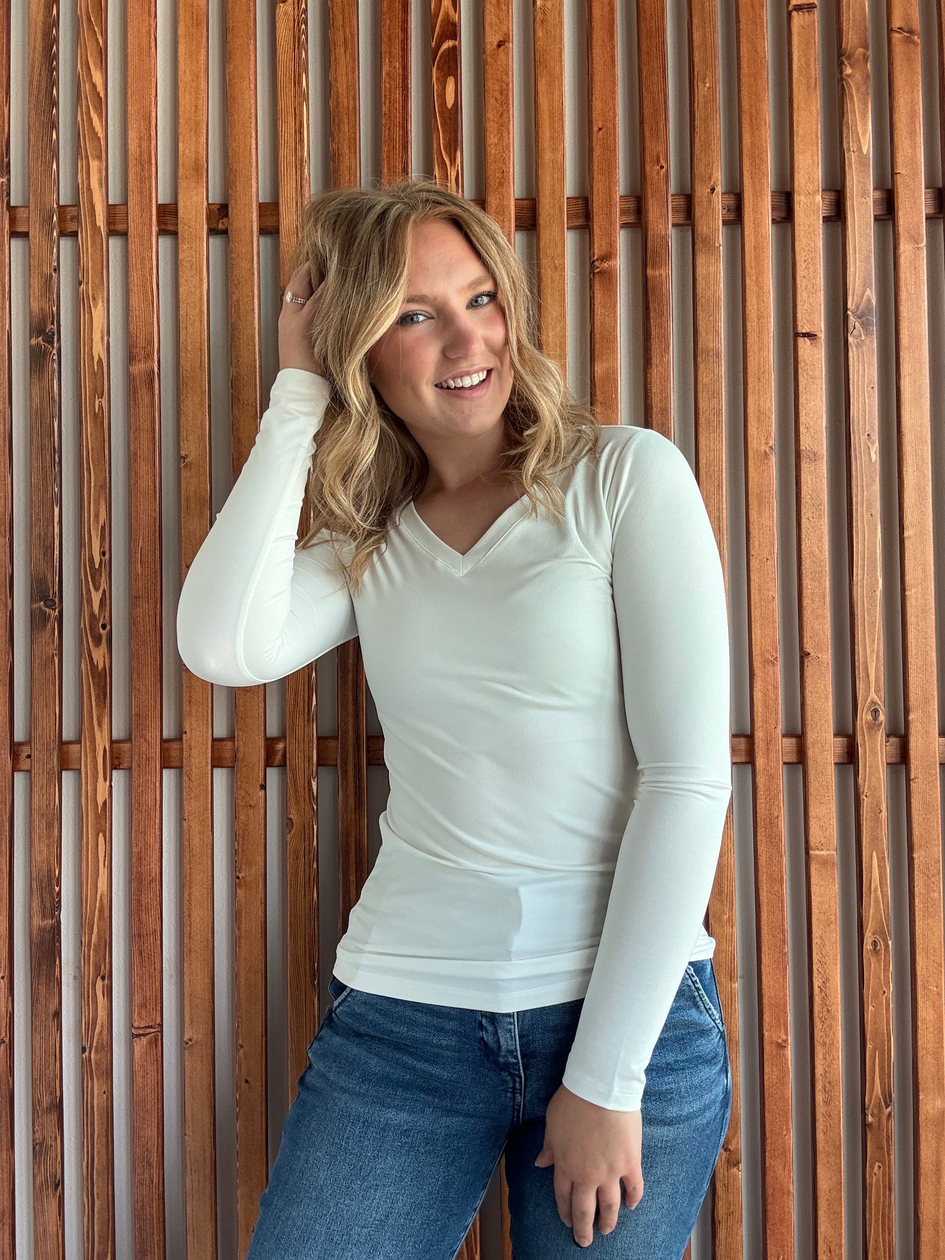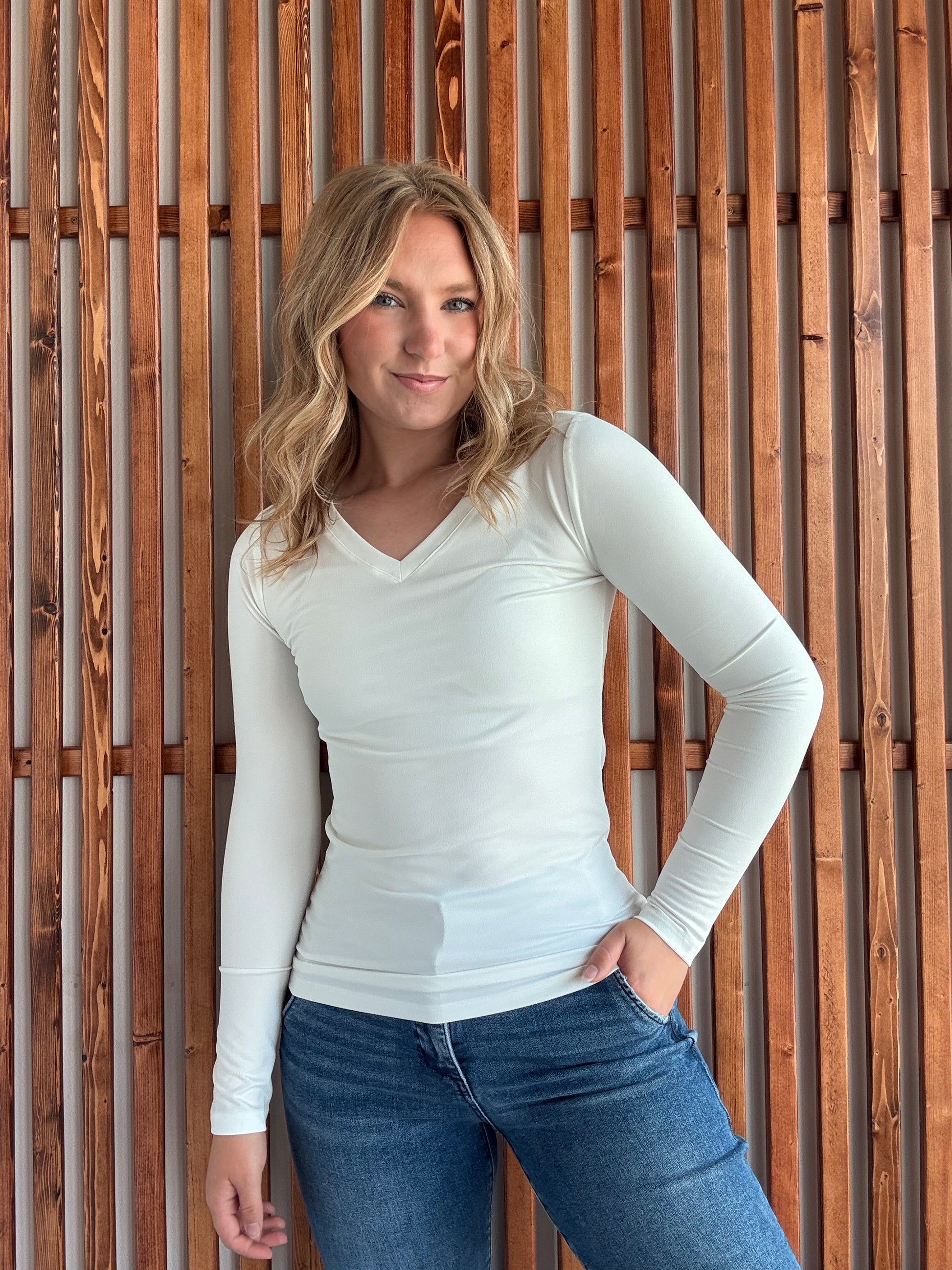 Wrap yourself in cozy comfort with this brushed microfiber long sleeve V-neck tee. Its buttery soft fabric feels like a gentle hug, while the perfect stretch moves with you all day long. Stay warm and stylish whether you're lounging at home or out on an adventure!