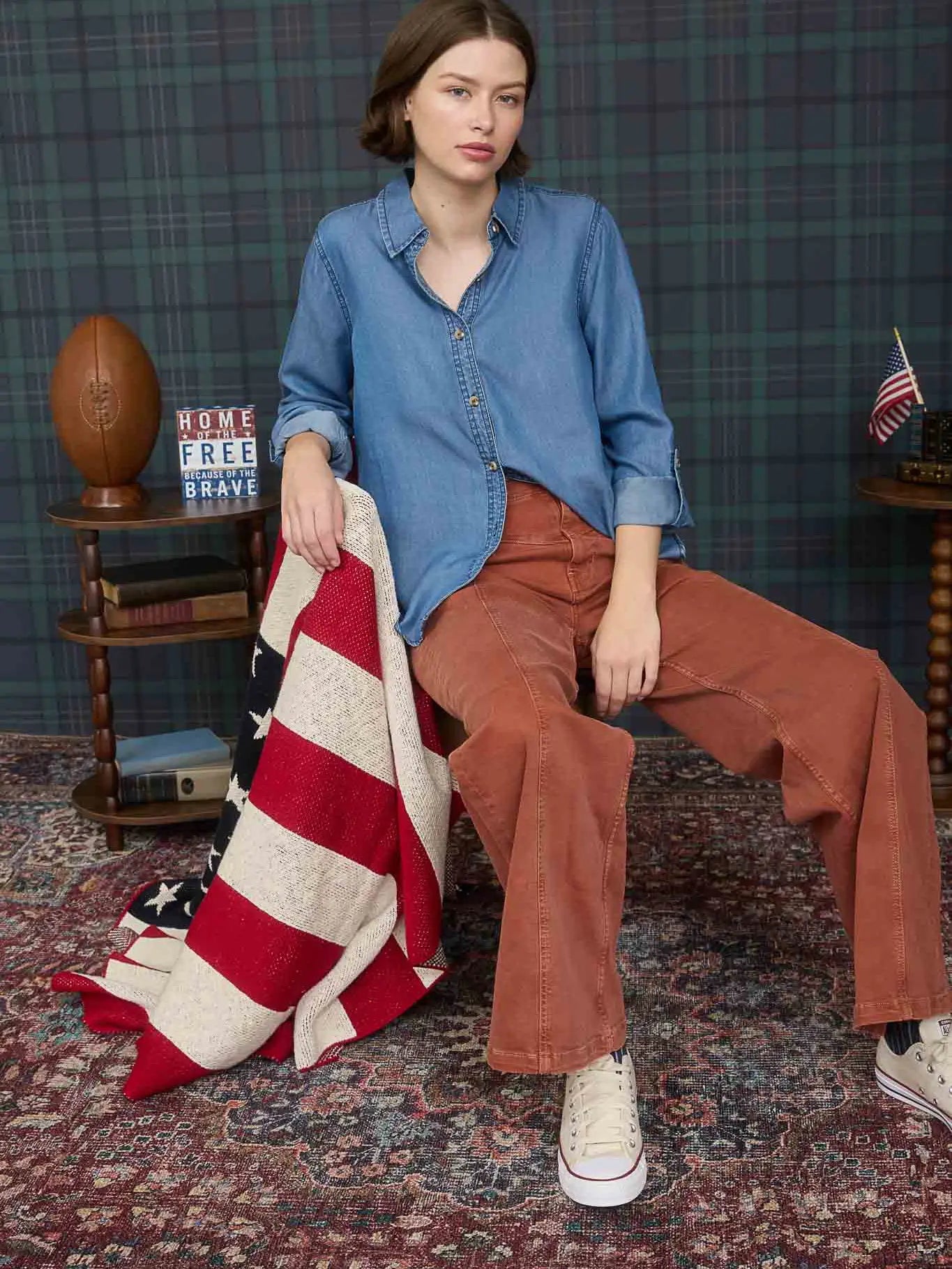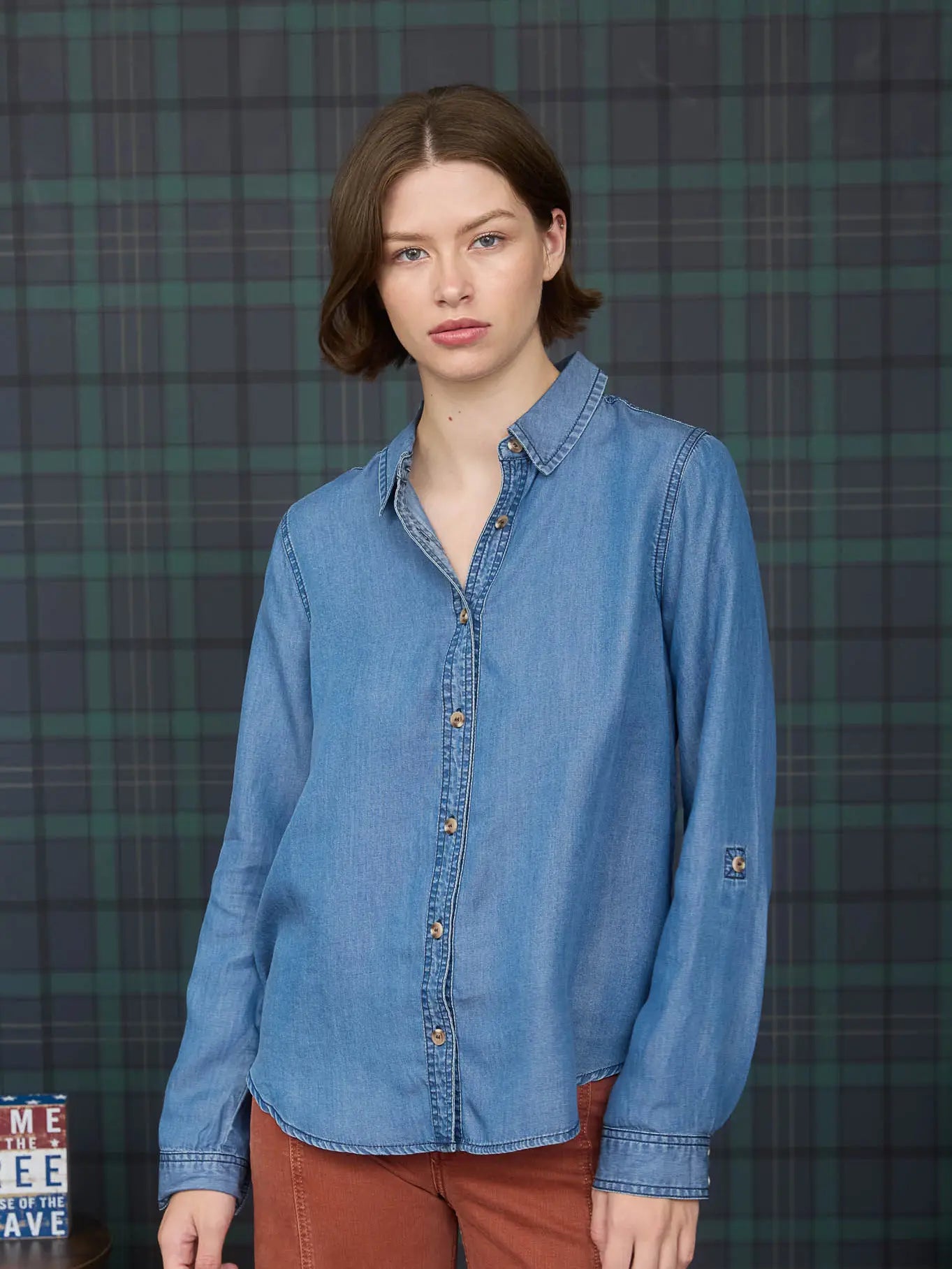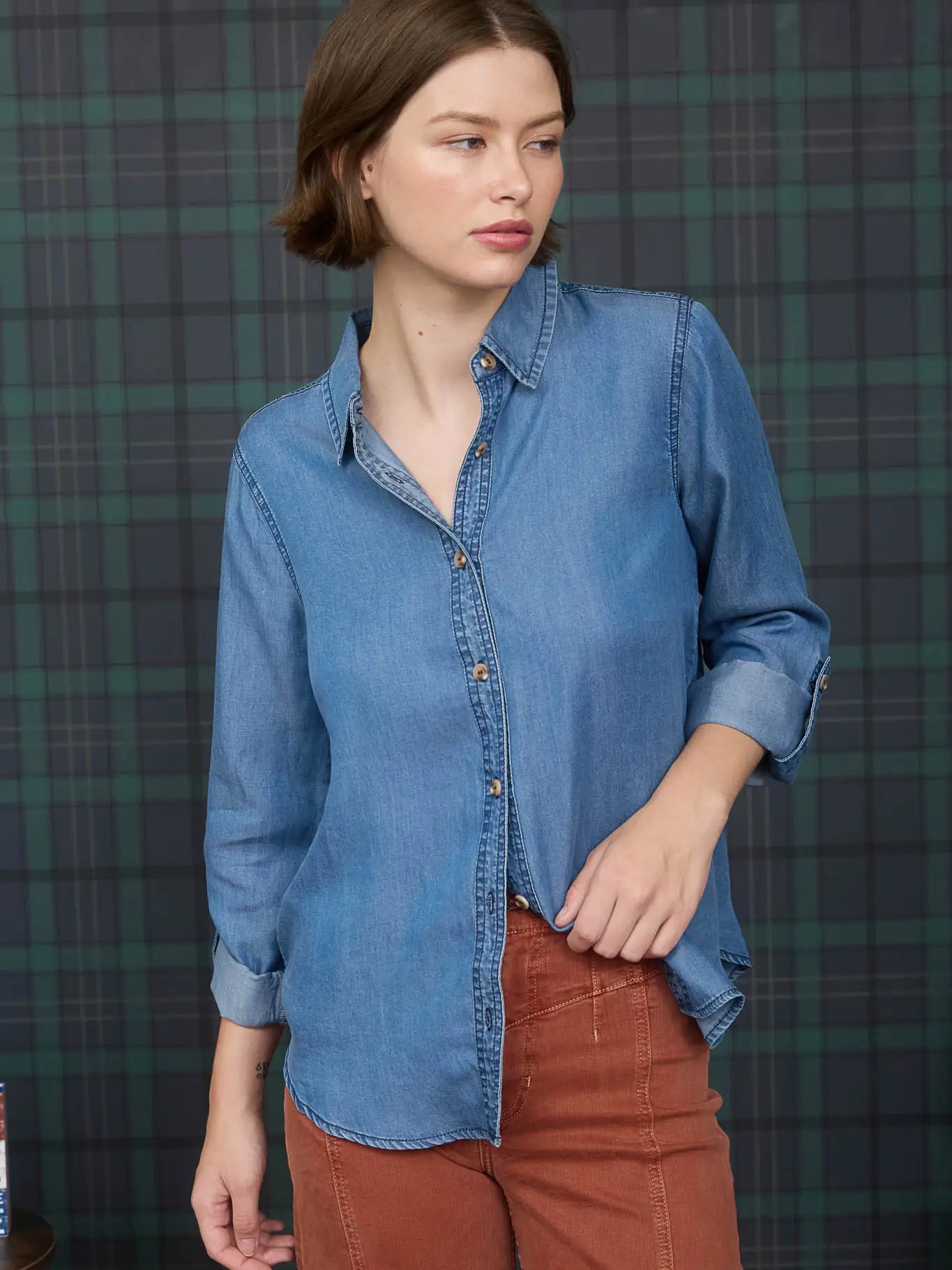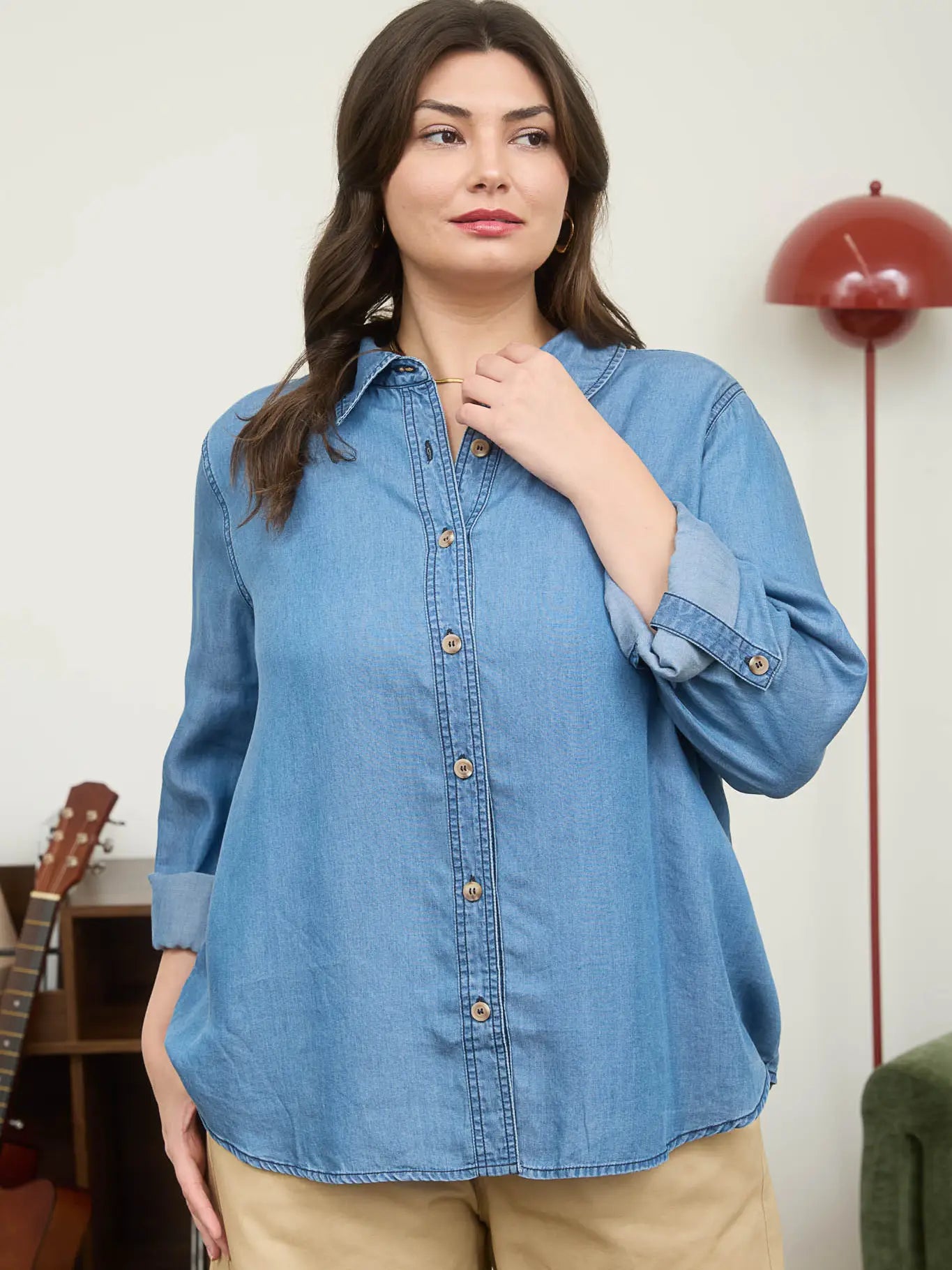 This playful chambray button-down shirt features a relaxed fit and 3/4 sleeves with convenient tabs to keep them neatly in place. The classic collar and woven solid chambray pattern make it perfect for layering or wearing on its own. With an easy U hem and lightweight design, it keeps you comfy without extra lining—ideal for a casual day out or cozy office vibes.