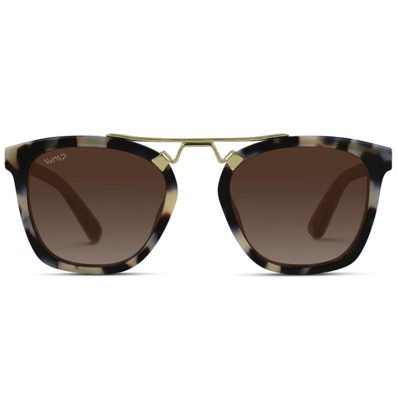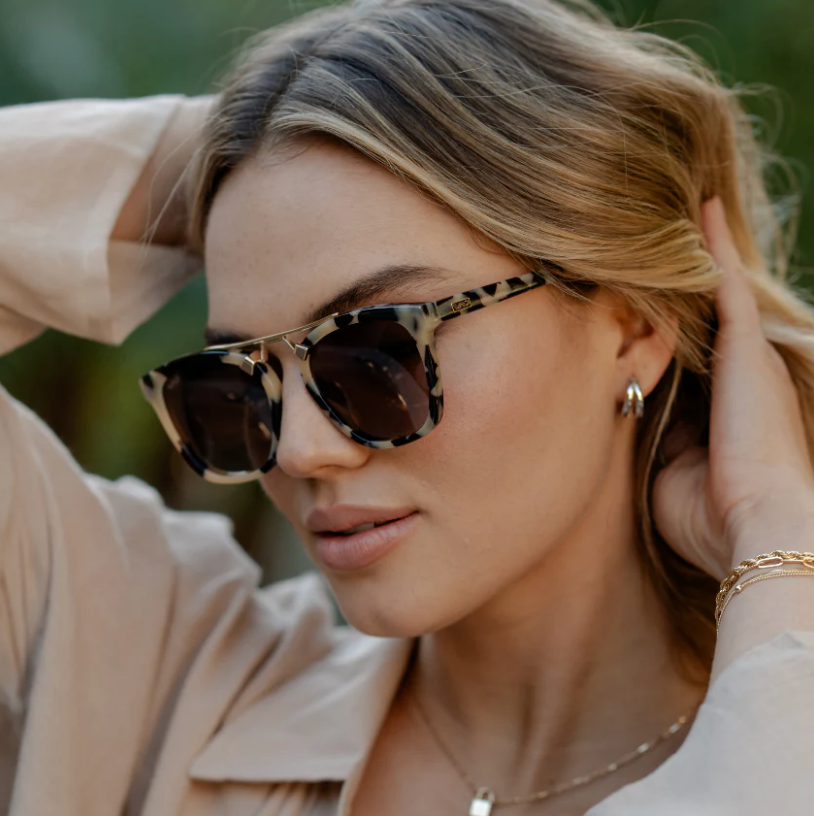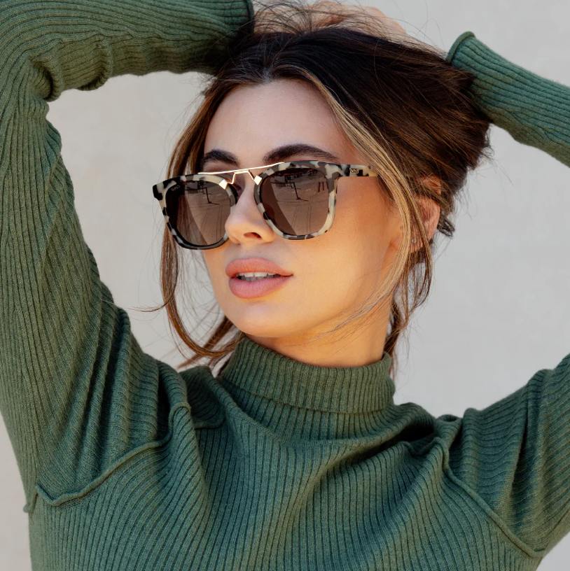 Demi is the definition of eye-catching thanks to an oversized square shape and gold metal floating double bridge design. Its lightweight acetate frame and polarized, 100% UV protection lenses provide practicality to these elevated glam shades.