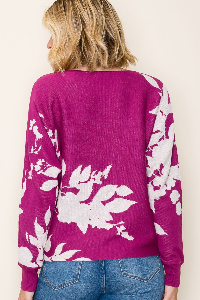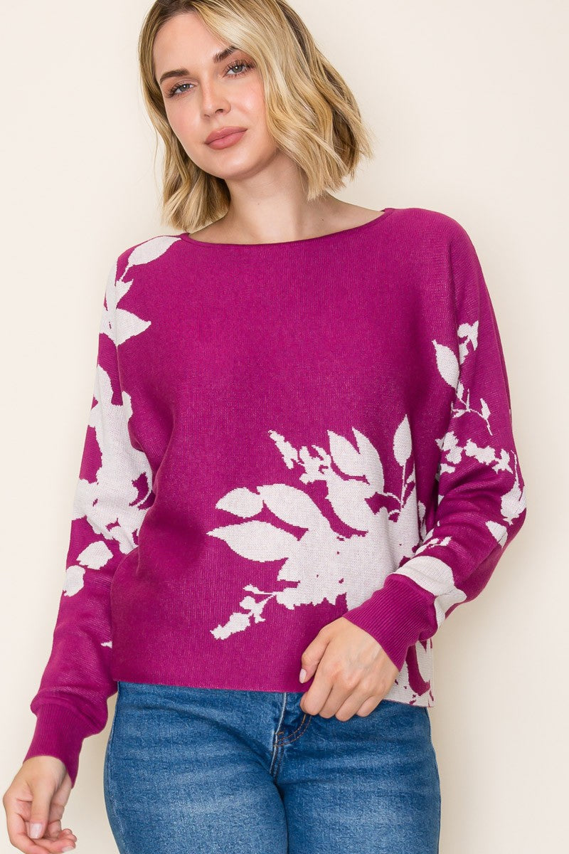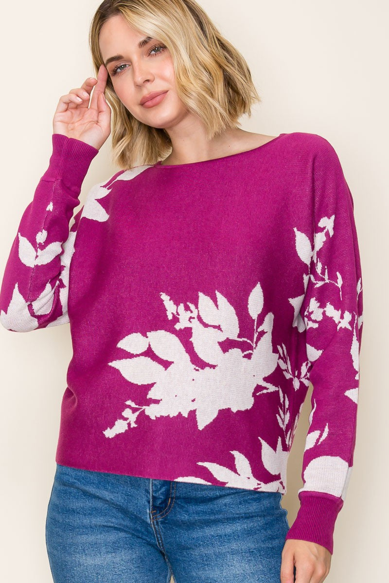Cozy meets charm in this Floral Jacquard Sweater in dark magenta. Featuring a wide neckline and long dolman sleeves, it offers a relaxed fit with a touch of whimsy. The intricate floral jacquard pattern adds playful texture and makes every day feel a bit more special. Perfect for layering or wearing solo on cooler days!