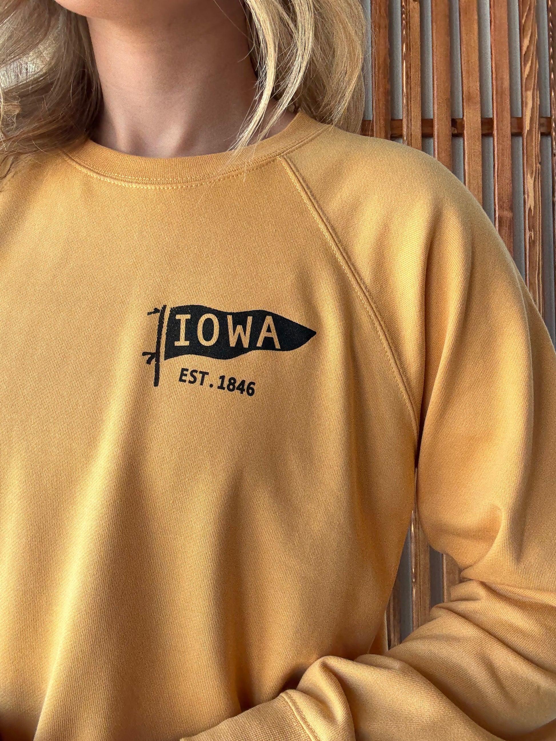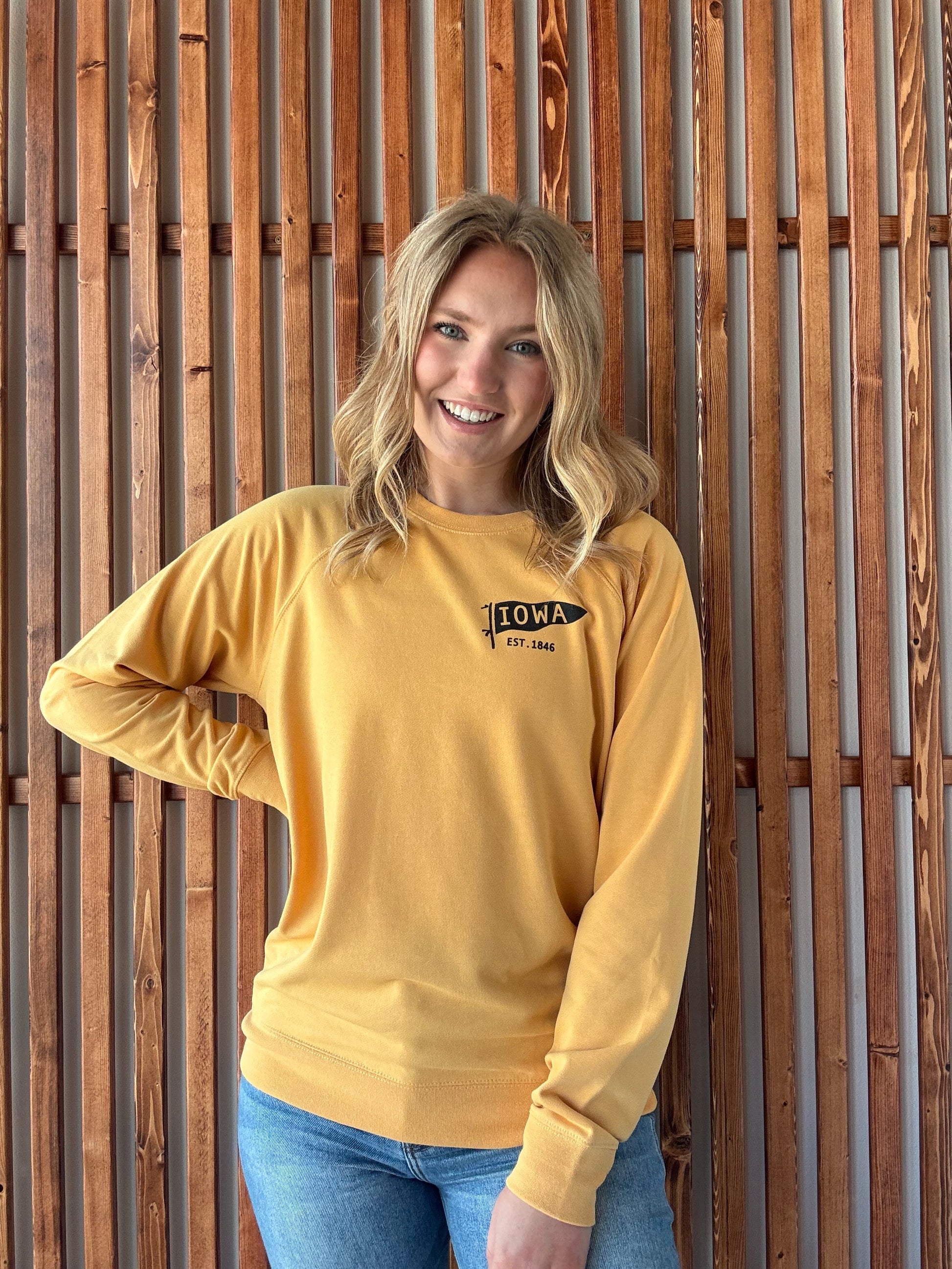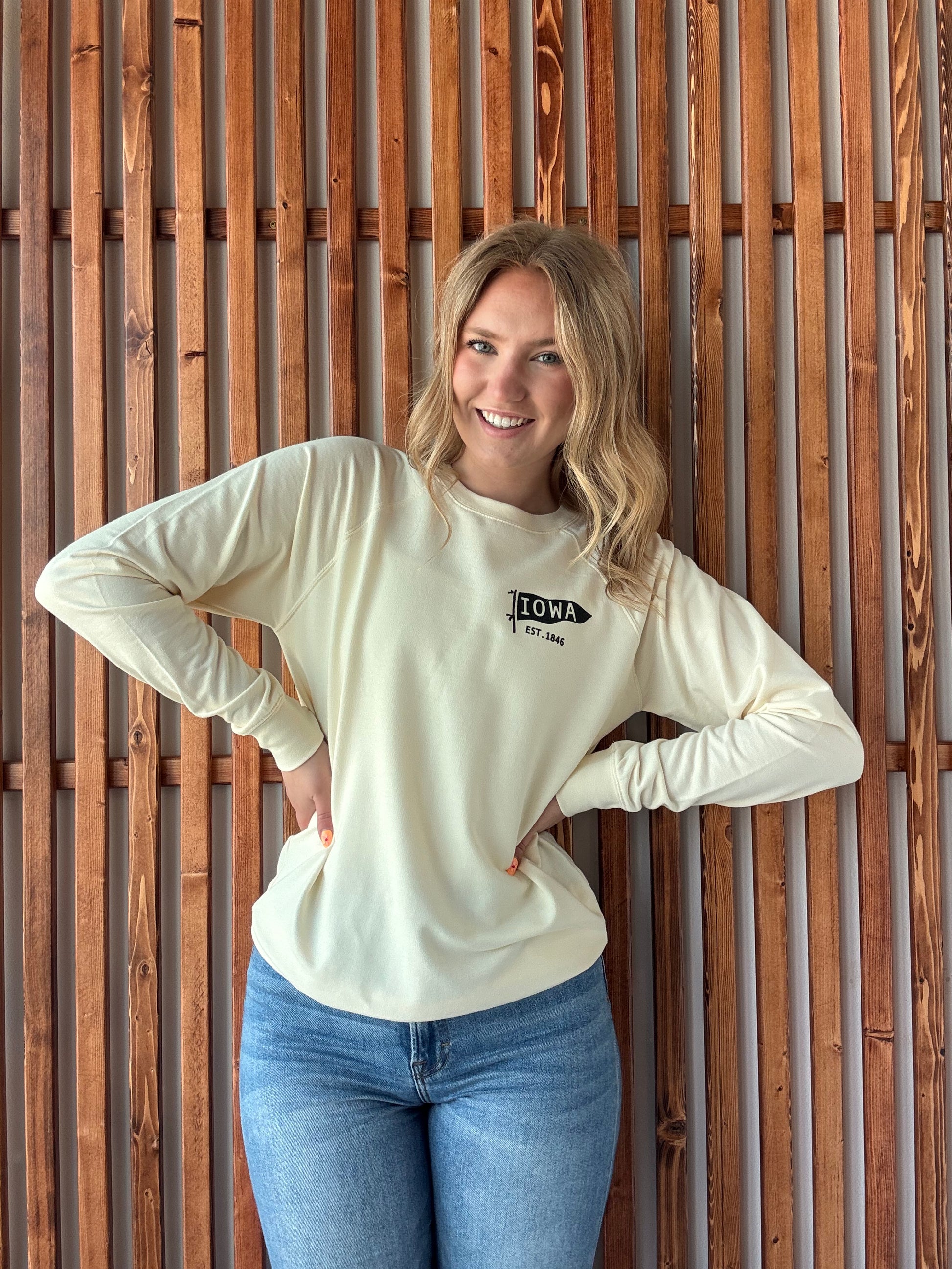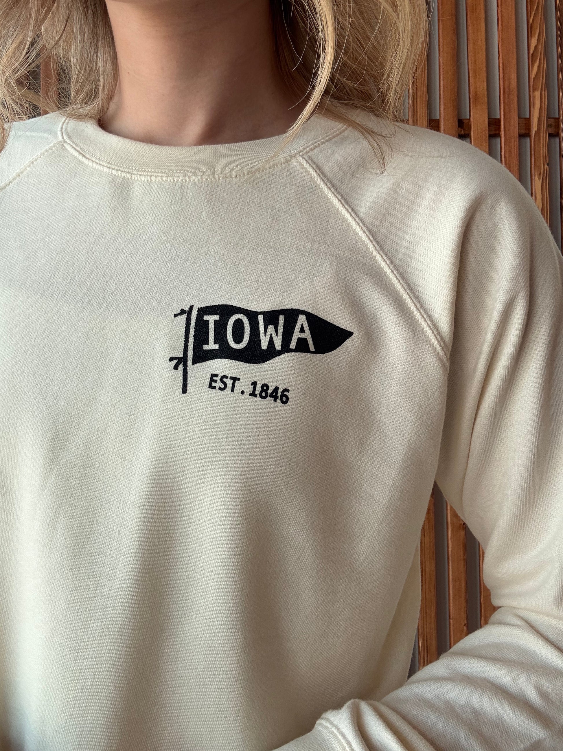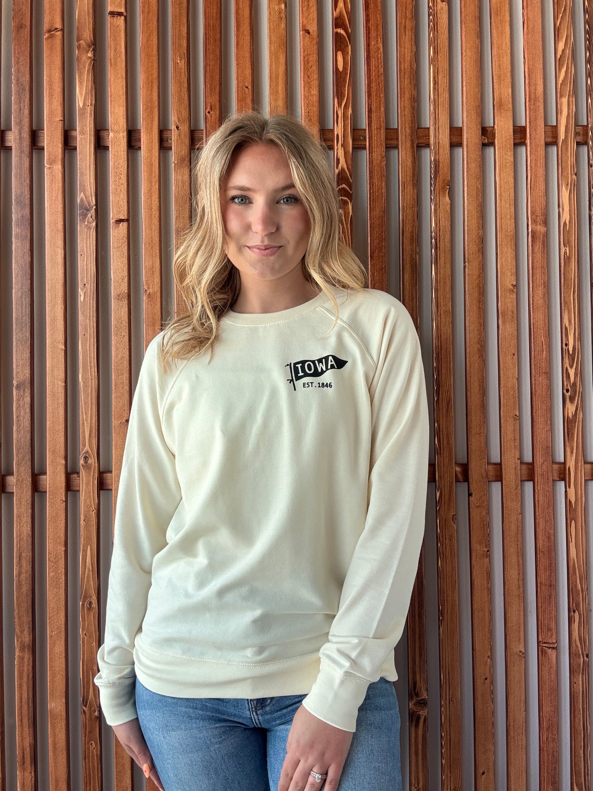 Celebrate your Iowa spirit with this lightweight crewneck sweatshirt, featuring a charming small Iowa flag on the left chest. Cozy yet breathable, it’s perfect for those days when you want to keep it casual and fun.