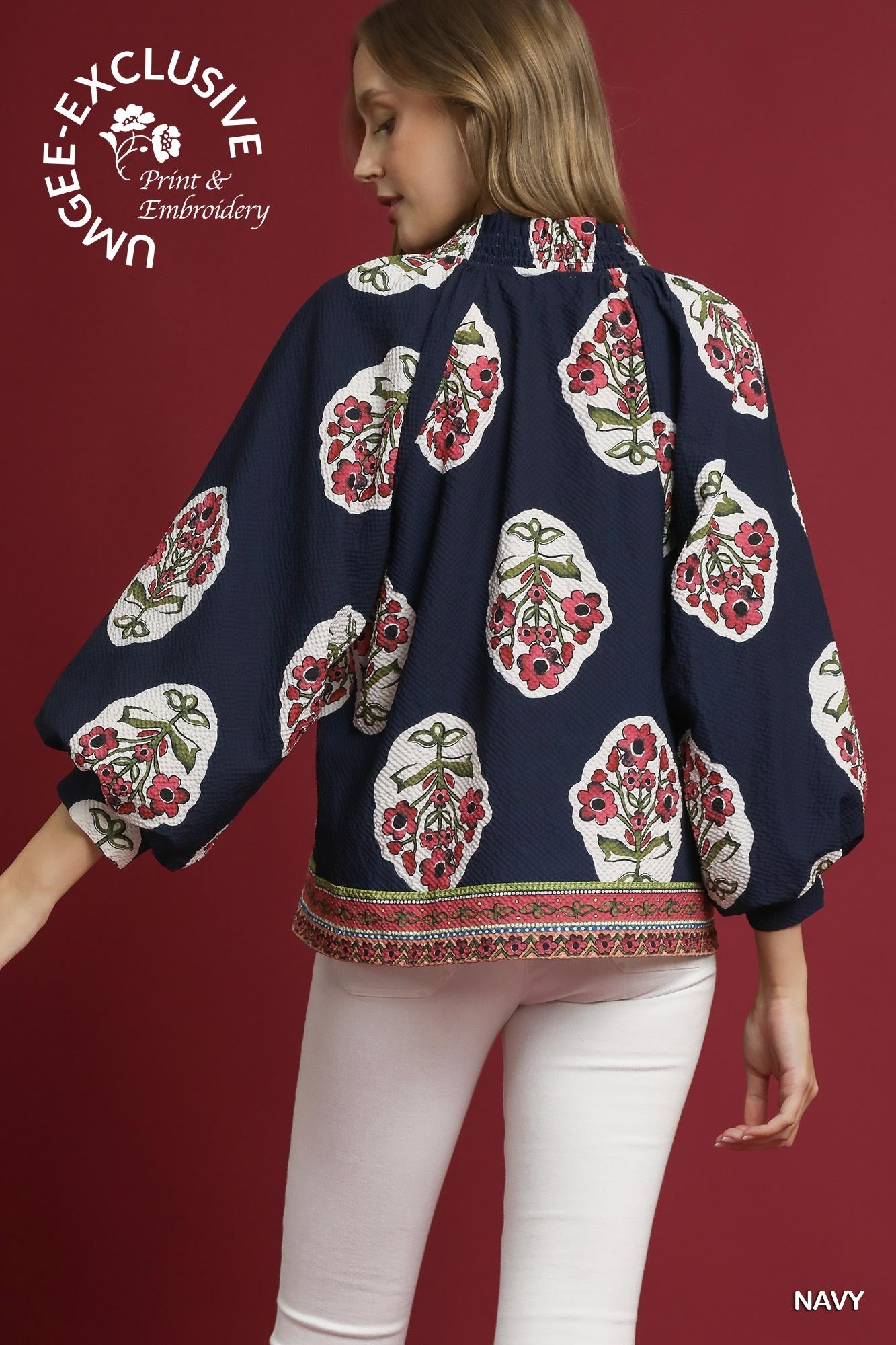 Embrace effortless style with this Navy Boho Floral Print Tunic Top. Featuring a playful split V-neck and wide, flowy 3/4 sleeves, it dances with every move. The straight hem is accented by a bold contrast border print that also highlights the placket and bottom, adding a fun pop of pattern. Lightweight and unlined, this tunic keeps things breezy and perfect for layering or wearing solo. Perfect for adding a touch of whimsy to your everyday look!