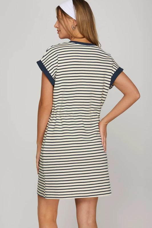 Cap Sleeve Stripe Knit Dress - Navy