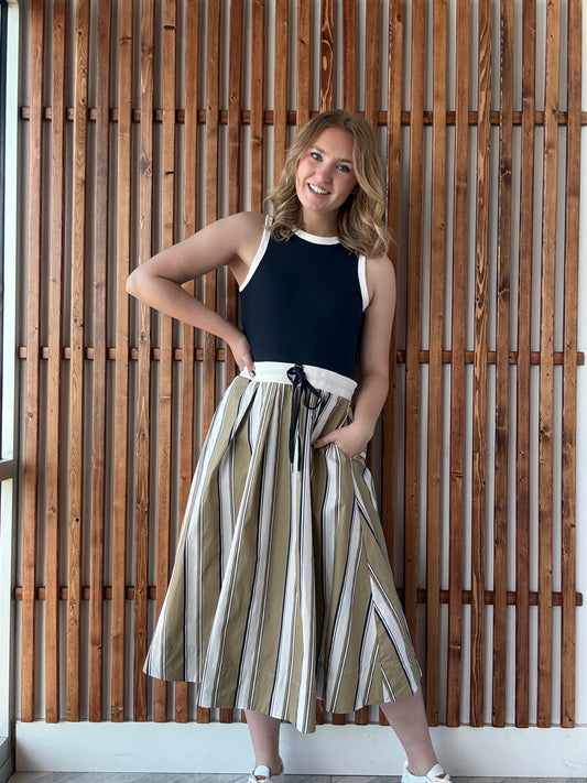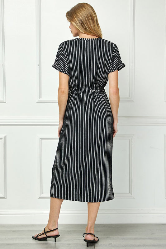 Stripe Drawstring Waist Midi Dress - Black