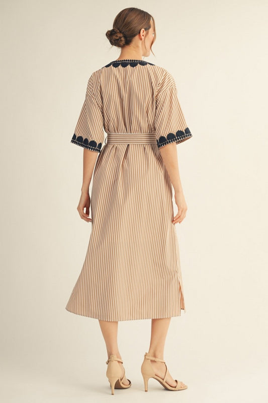 Embroidery Accent Stripe Midi Dress - Mocha Mousse