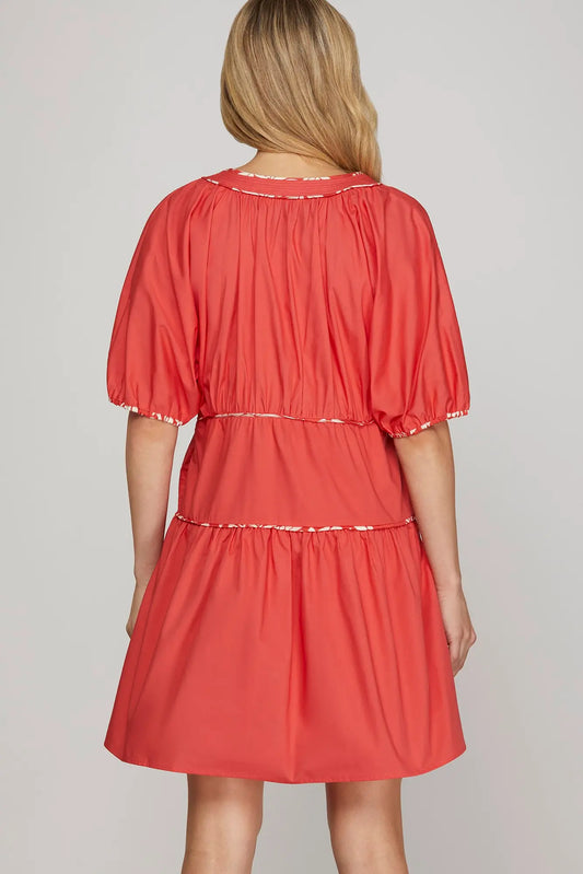 Puff Sleeve Contrast Piping Dress - Red