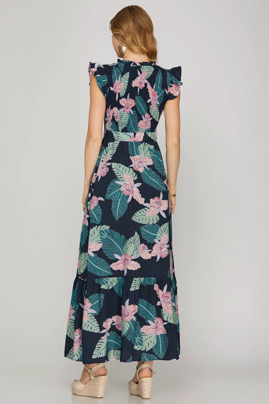 Tropical Print Tiered Maxi Dress - Navy