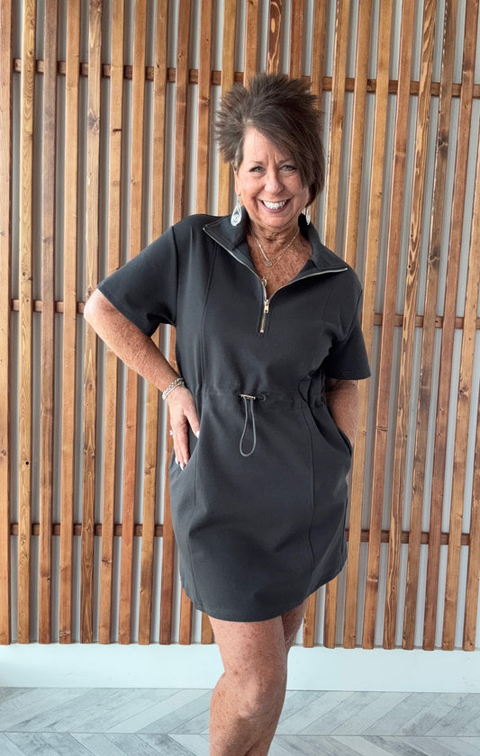 Half Zip Drawstring Waist Scuba Dress - Charcoal