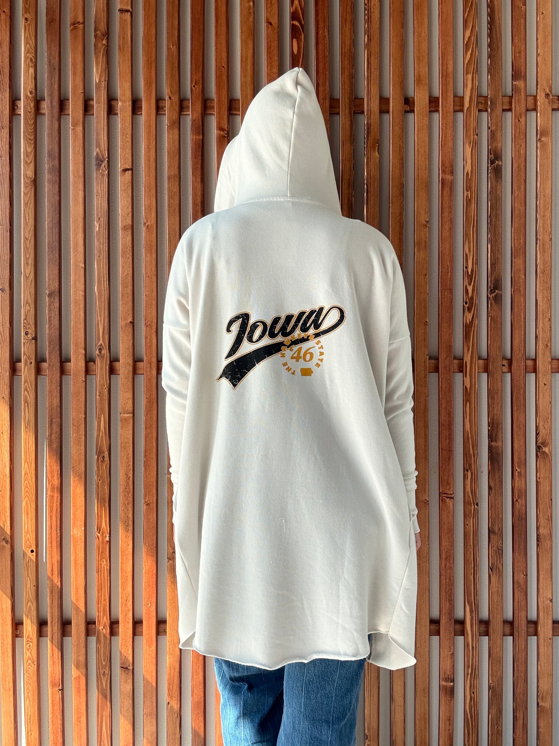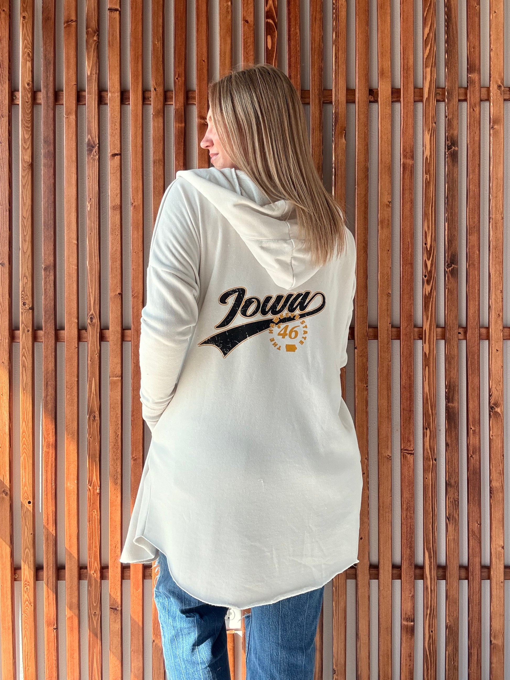 Stay cozy and stylish in the Hawkeye State '46 Cardigan! Featuring handy pockets and a comfy hood, this cardigan is perfect for everyday adventures or cheering on your favorite team. With a playful nod to Iowa pride, it’s your new go-to for warmth and fun flair.
