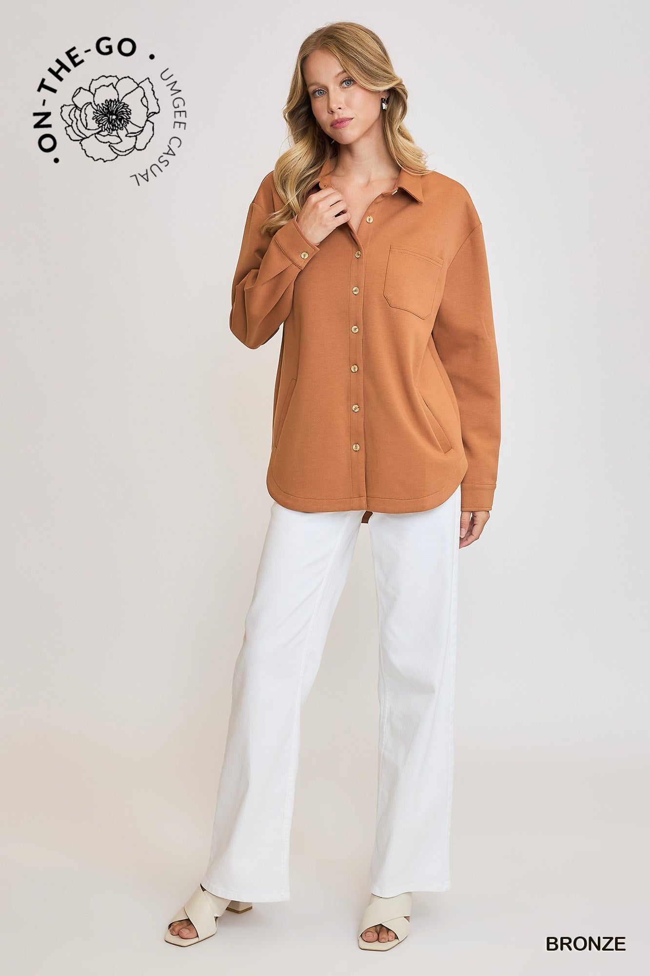 Step into cozy chic with the Luxeknit Oversized Shirt Jacket in Bronze. Crafted from soft, stretchy Luxeknit fabric, it offers a roomy, comfortable fit that moves with you. The playful curved split hemline adds a flirty touch to your layering game, making this jacket perfect for effortless style and all-day comfort.