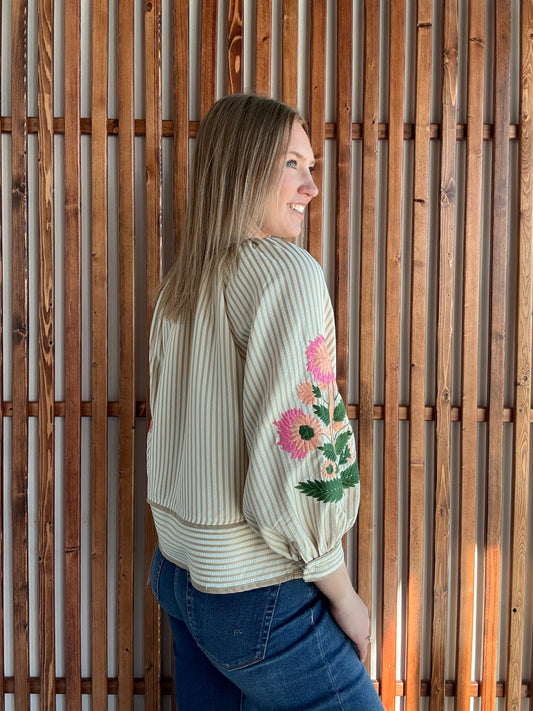 Stripe Embroidered Floral Long Sleeve - Oatmeal