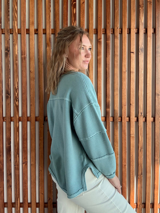 Ribbed Raw Seam Details Long Sleeve - Dusty Blue
