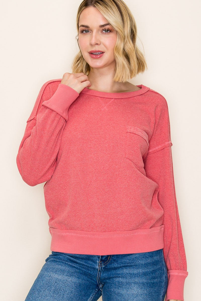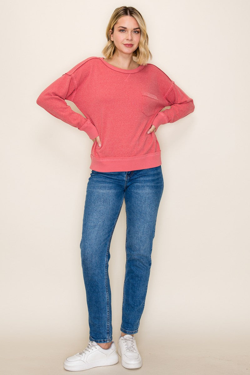 Wrap yourself in pure comfort with this brushed knit pullover that's as stylish as it is snuggly. The wide crew neck and long sleeves create an effortlessly relaxed silhouette, while the exposed stitching adds a charming, artisanal touch that sets it apart. Crafted from super cozy fabric that feels like a warm hug, this light rust beauty is your new go-to for casual days when comfort meets cool. Layer it, wear it solo—either way, you'll be reaching for this one constantly.