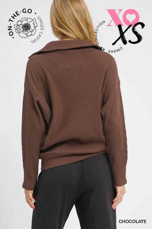 Ribbed Hi-Low V-Neck Long Sleeve - Brown