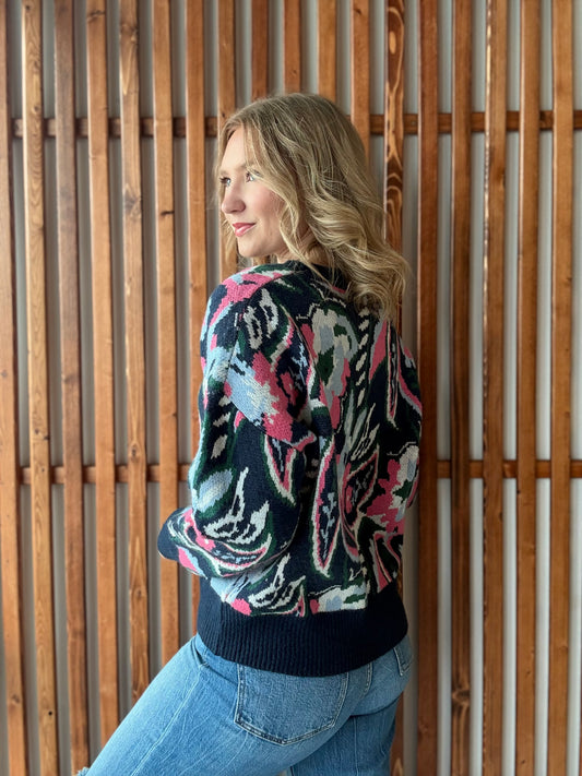 Paisley Knit Sweater with Ribbed Trim - Navy/Pink