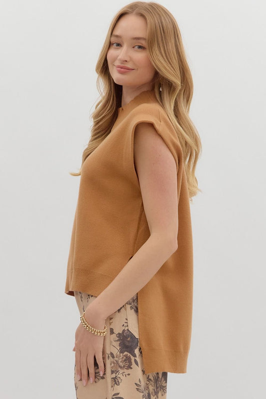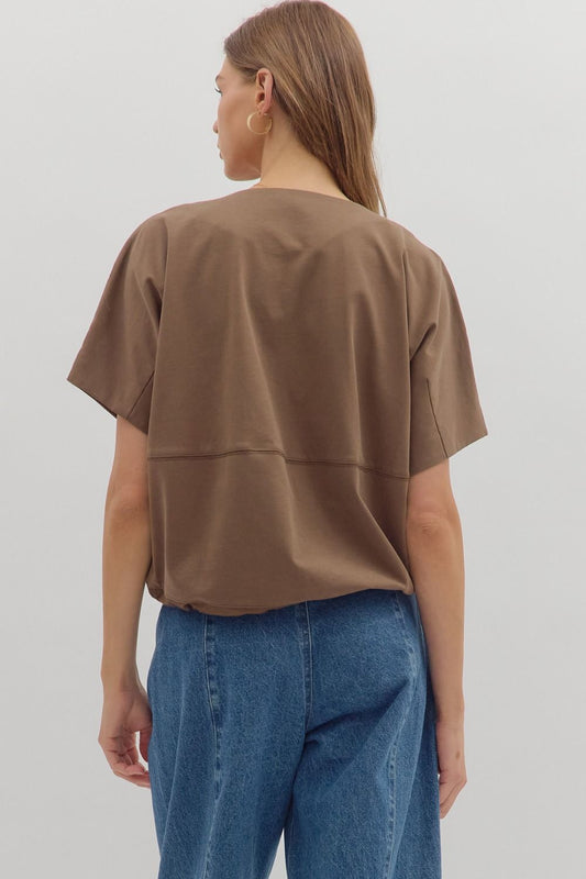 Short Puff Sleeve Mock V-Neck Top - Caramel