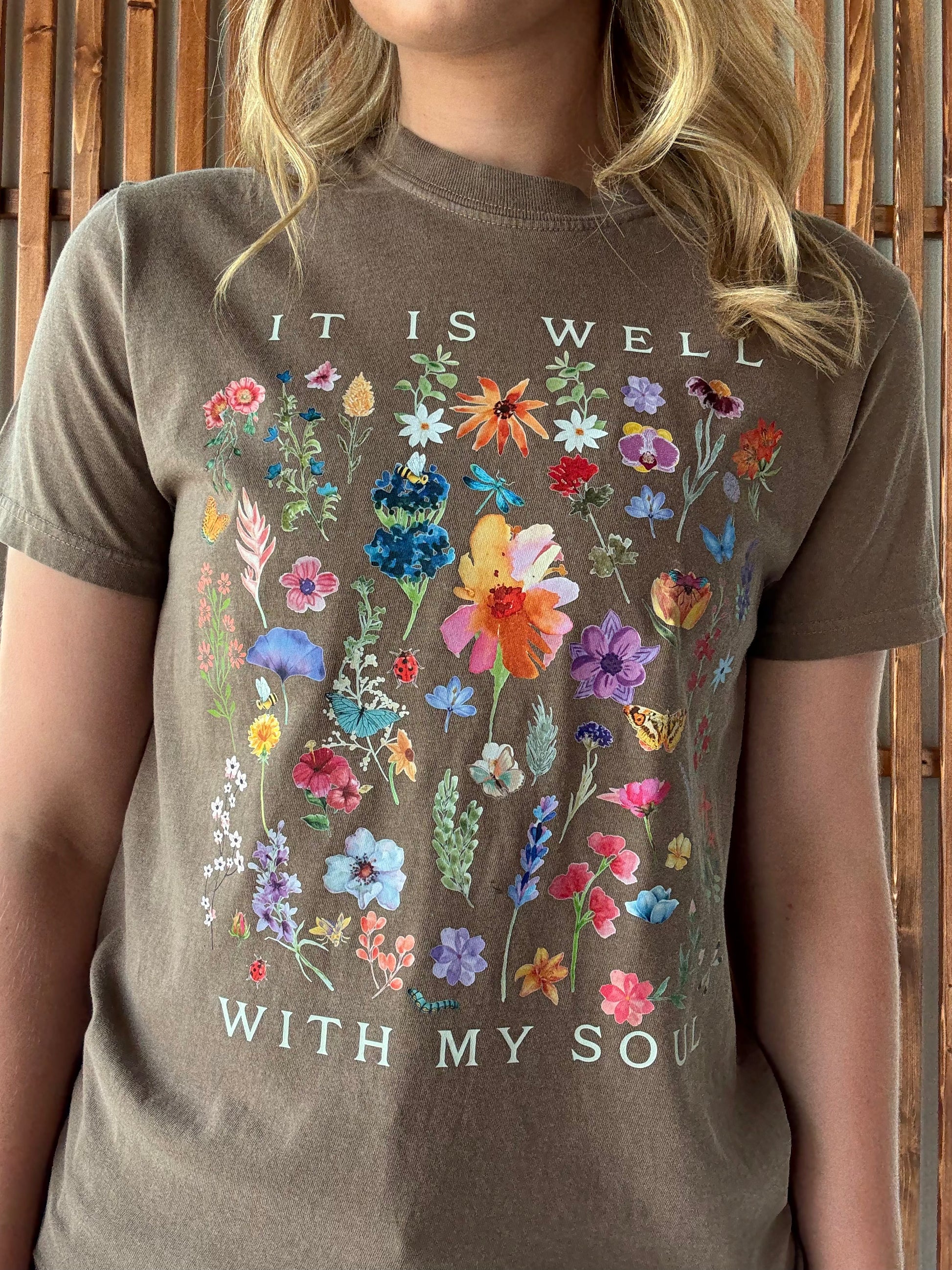 This playful brown tee features the inspiring "It is well with my soul" quote surrounded by delicate floral designs. It's a cheerful way to express positivity and add a splash of charm to your everyday look. Comfortable and stylish, it’s perfect for brightening your day with a joyful message.