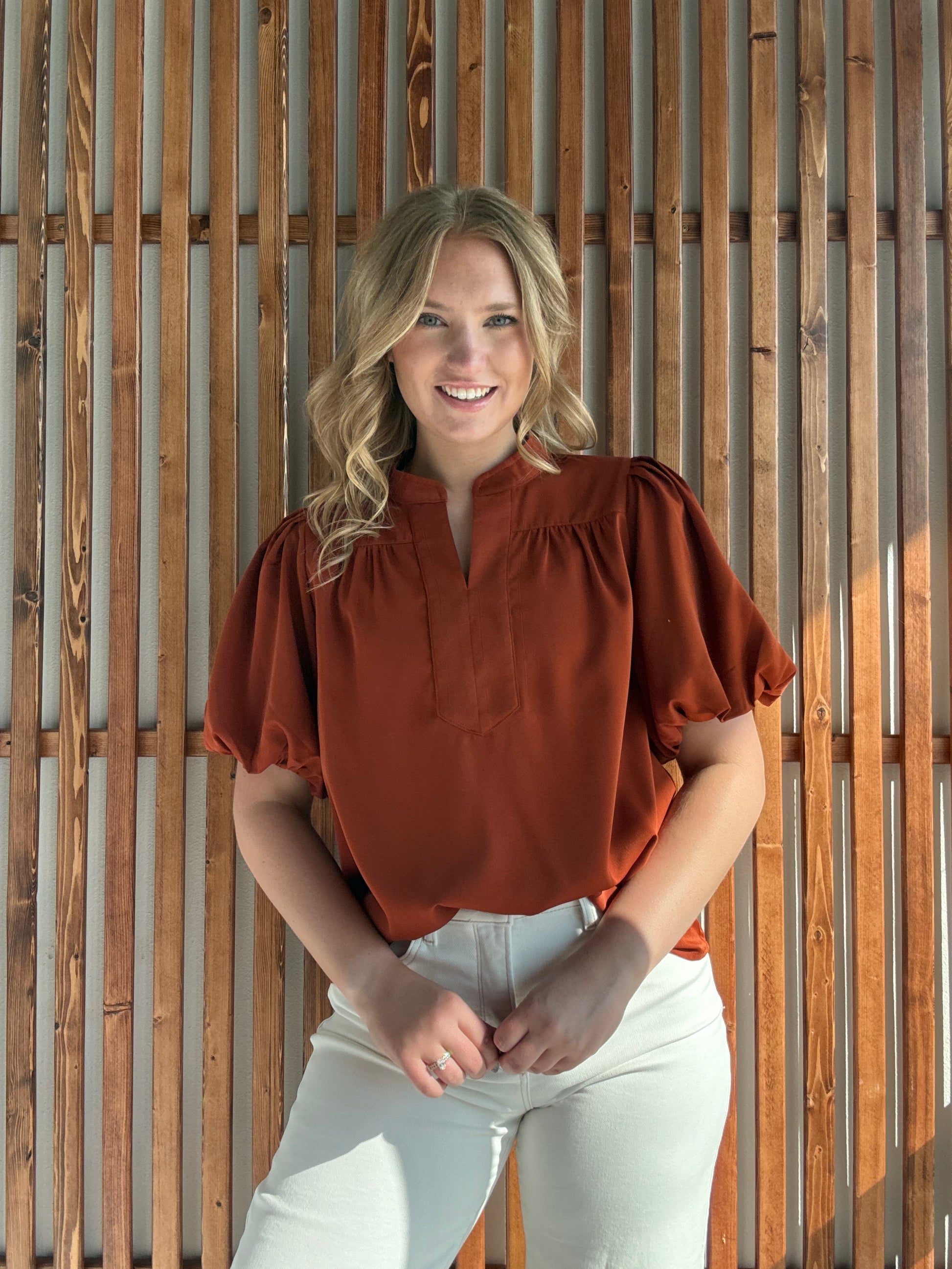 Short Puff Sleeve Mock V-Neck Top - Caramel