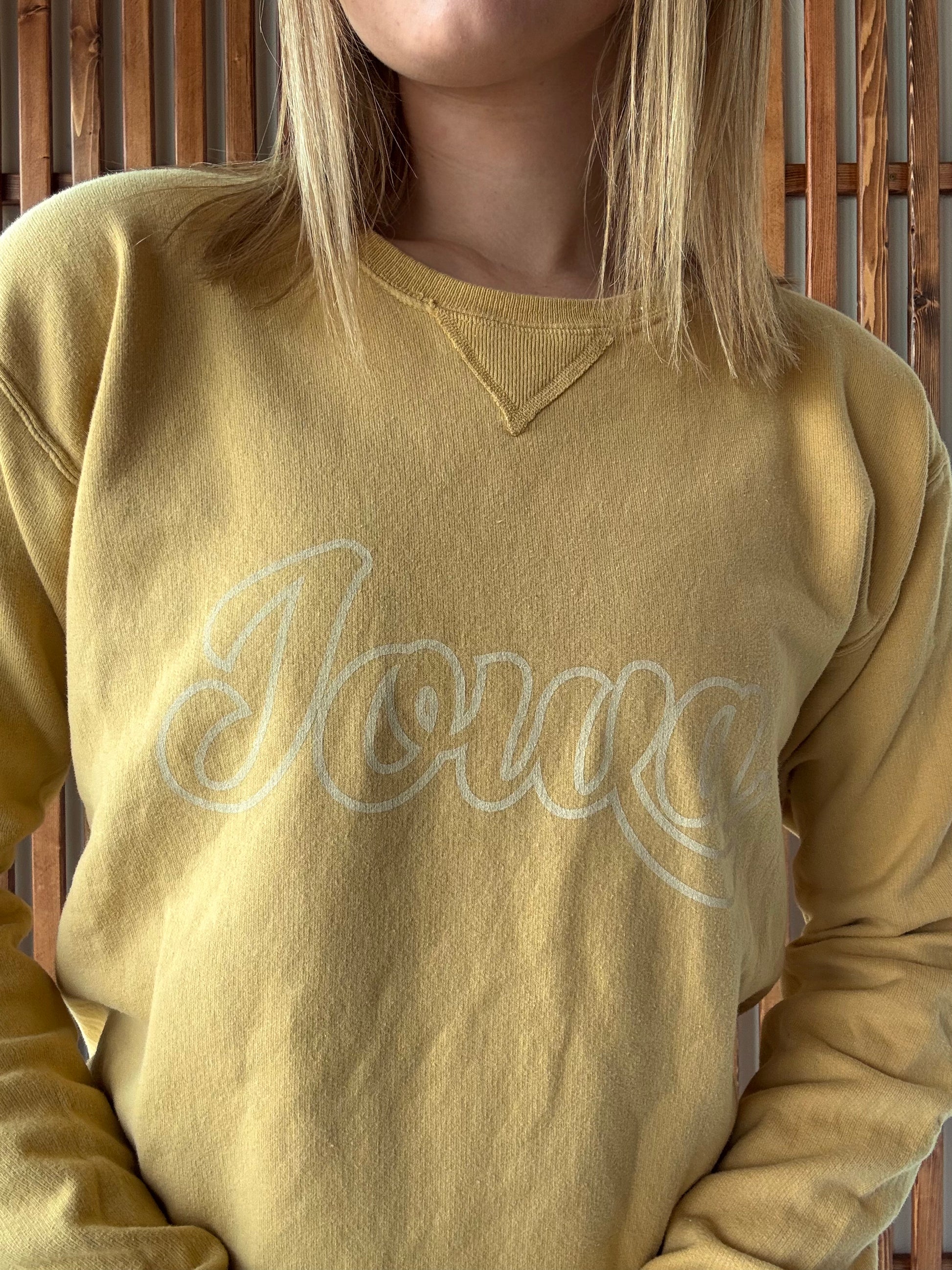 Stay cozy and stylish with this lightweight beige sweatshirt featuring a simple vintage Iowa design in gleaming gold. Perfect for adding a playful touch to your casual look while enjoying comfort all day long.